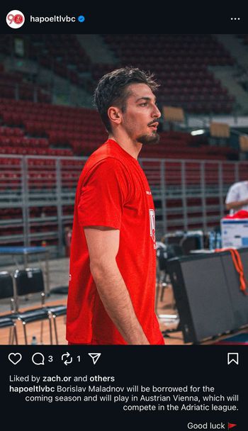 Израелският клуб Апоел Тел Авив, който ще играе домакинските си мачове през новия сезон в Евролигата в България, обяви, че преотстъпва на австрийския клуб Виена българския национален гард Борислав Младенов.