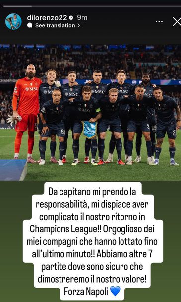 “Като капитан поемам отговорност, съжалявам, че усложних завръщането ни в Шампионска лига!! Горд съм със своите съотборници, които се бореха до последната минута!! Остават ни още 7 мача, в които съм убеден, че ще покажем нашата стойност! Форца Наполи”, написа Ди Лоренцо в Инстаграм към отборна снимка преди началото на мача.