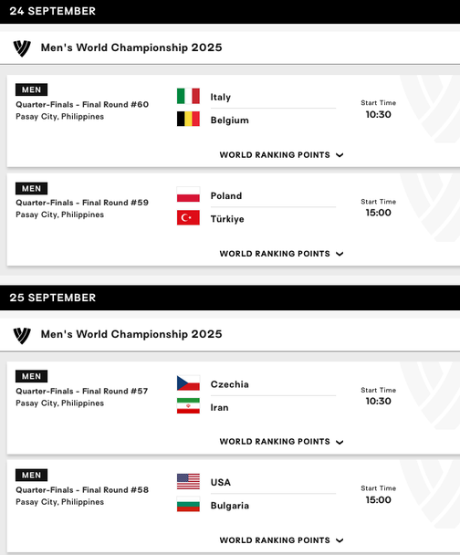 Днес, след като се изиграха всички срещи от 1/8-финалите, стана ясен и точният начален час на двубоя България - САЩ, който ще се играе на 25 септември, четвъртък, от 15:00.