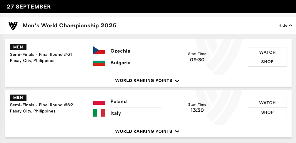 От Международната волейболна федерация (FIVB) обявиха началните часове на двата полуфинала на Световното първенство за мъже във Филипините.