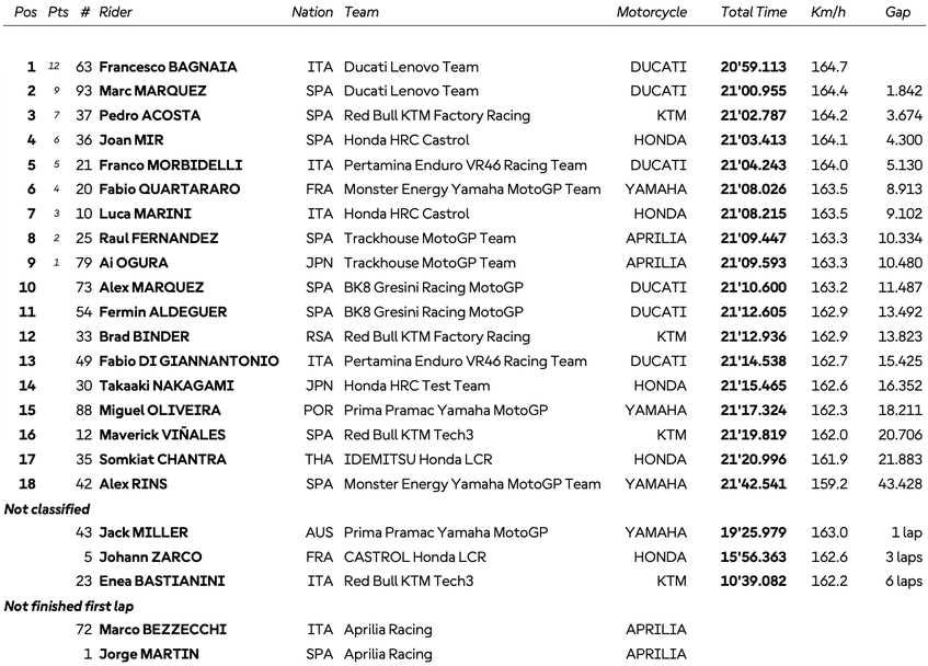 Испанецът направи доста колебливо начало, след като беше изпреварен от Педро Акоста в първата обиколка, след което прекара много време зад бившия си съотборник Жоан Мир. Маркес имаше нужда от не една, не две, а цели три атака, за да изпревари пилота на Хонда, но в крайна сметка той го стори с блокираща маневра в десетия завой на осмата от 12 обиколки.