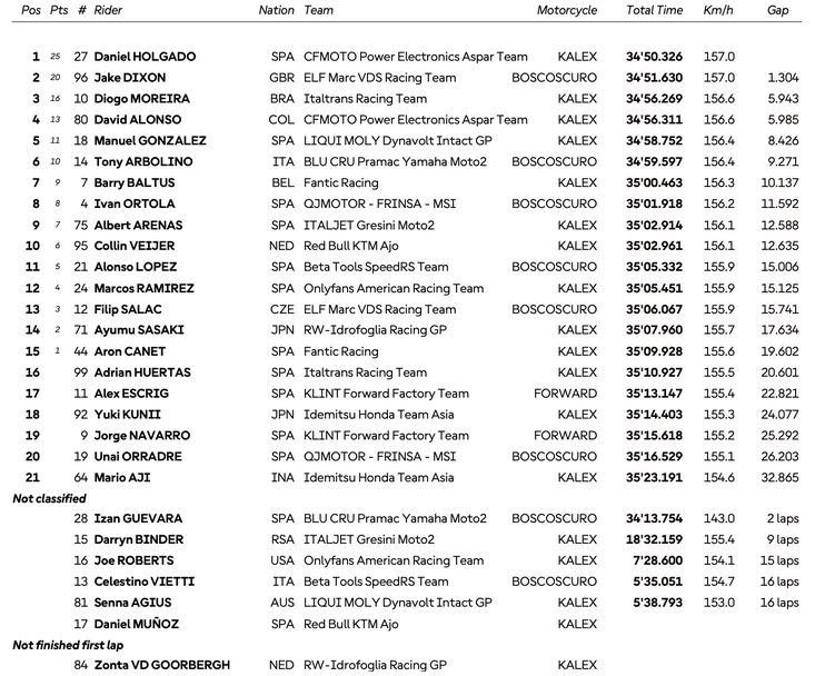 В средата на дистанцията от 19 тура авансът на испанеца пред Джейк Диксън беше достигнала почти пет секунди, което позволи на лидера да отпусне газта и да намали риска във финалните обиколки. Така на финала разликата между него и завършилият втори Диксън падна до само 1.3 секунди, но въпреки това победата на Олгадо си остава наистина доминантна.