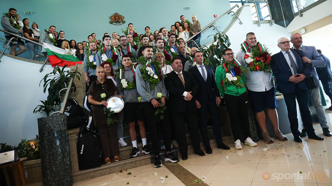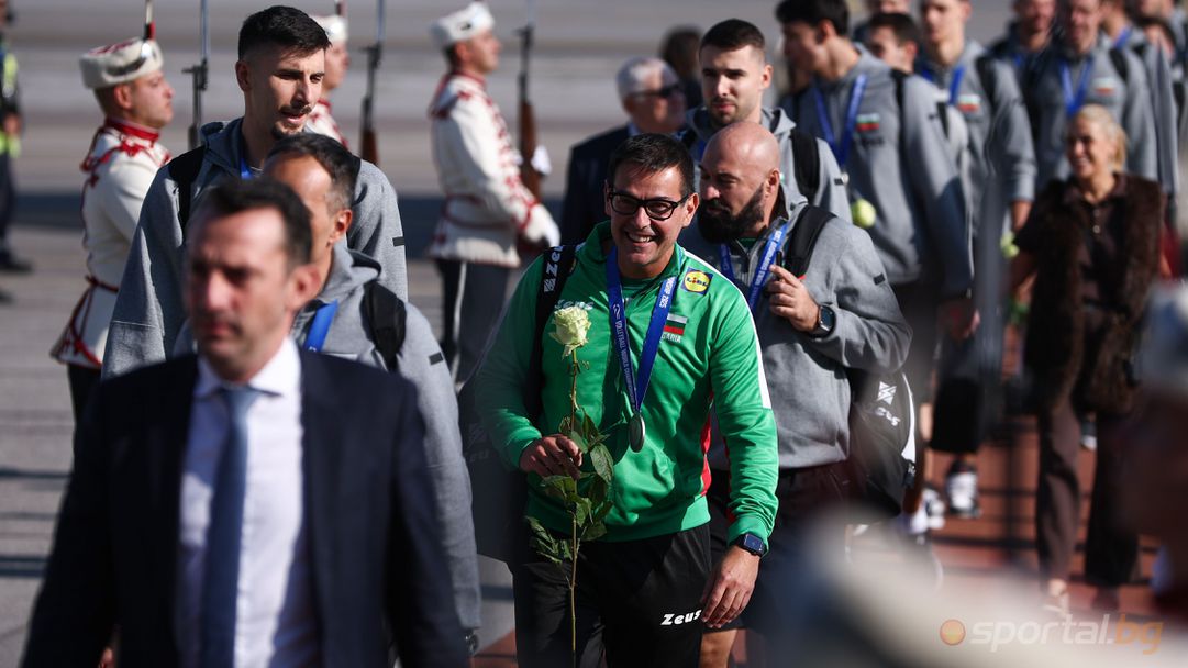 Първа от самолета слязоха президентът на Българската федерация по волейбол Любомир Ганев, старши треньорът Джанлоренцо Бленджини, както и капитанът Алекс Грозданов. Сред посрещачите бе заместник министър-председателят Атанас Зафиров, както и координаторът на националните отбори Николай Иванов.
