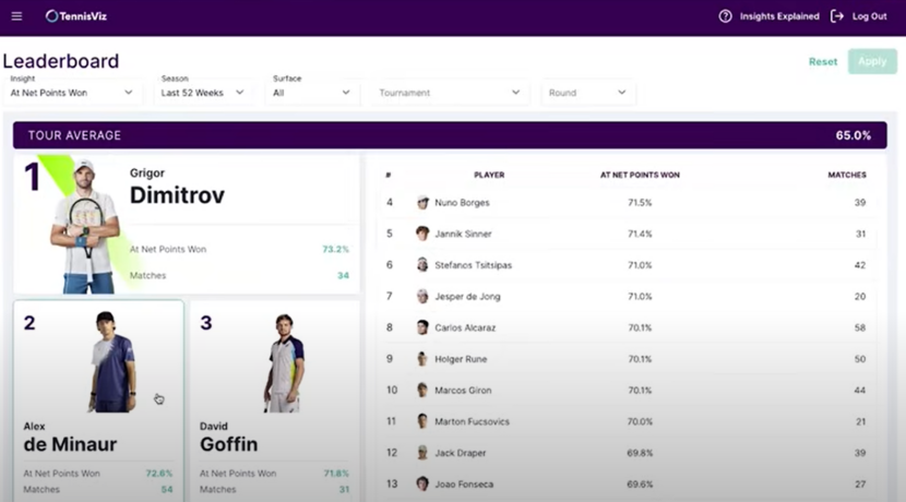Само още 10 тенисисти в целия тур могат да се похвалят с над 70% ефективност при излизанията напред. Втори е Алекс де Минор със 72,6%, следван от Давид Гофен със 71,8%.