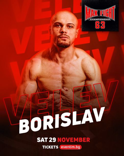 Професионалният боксьор Борислав Велев ще оглави 63-тото издание на бойната верига MAX FIGHT. Нокаутьорът от София е първият потвърден боец за галата, която ще се проведе на 29-и ноември в спортна зала “Левски София”.