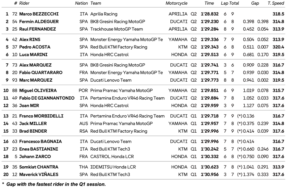 Алекс Ринс беше много близо до това да стартира от първата редица за първи път като пилот на Ямаха, но падане в самия край на квалификацията го остави на четвъртото място с пасив от 0.052 спрямо Фернандес. До Ринс на втората редица ще застанат Педро Акоста и Лука Марини, а на третия ред ще се наредят Алекс Маркес, Фабио Куартараро и световният шампион Марк Маркес.