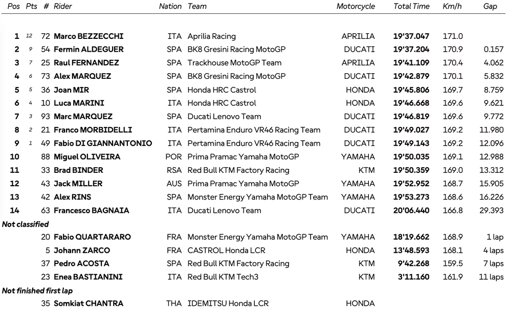 Последните две места в зоната на точките бяха завоювани от съотборниците във VR46 Дукати Франко Морбидели и Фабио Ди Джанантонио. До финала на спринта стигнаха още Мигел Оливейра, Брад Биндър, Джак Милър, Ринс и Франческо Баная, който за 13 обиколки натрупа изоставане от над 29 секунди спрямо победителя Бедзеки.
