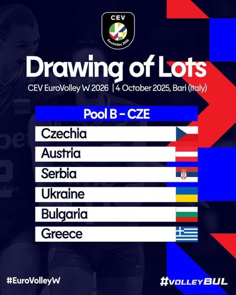 България ще се изправи срещу Австрия, европейския вицешампион Сърбия, Украйна, Гърция и домакина Чехия в груповата фаза на Евро 2026 по волейбол при жените, отреди тегленият в италианския град Бари жребий. Мачовете от група "В" с участието на българския отбор ще се играят в чешкия град Бърно. Европейското първенство ще се проведе между 21 август и 6 септември в Турция, Чехия, Азербайджан и Швеция.