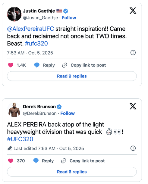 "Алекс Перейра е истинско вдъхновение! Върна се и си взе титлата на два пъти! Звяр!", написа бившият претендент за пояса при 70-килограмовите Джъстин Гейджи.