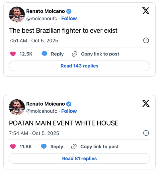 "Най-добрият боец от Бразилия, който някога е съществувал. Трябва да бъде в главната битка в Белия дом!", заяви боецът от лека категория Ренато Мойкано.