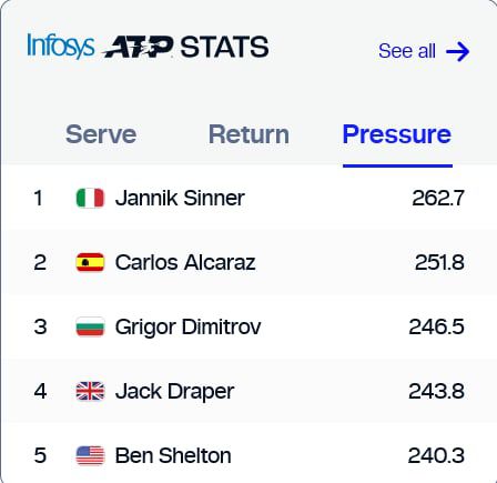 Интересното е, че първата ни ракета е далеч пред Алкарас по отношение на спечелените тайбреци (73 срещу 63 процента) и превъзхожда Синер, когато се стигне до изиграването на решителен сет (69 срещу 67 процента).