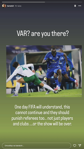 "ВАР, там ли си? Един ден ФИФА ще разбере, това не може да продължава и трябва да наказват и съдии, не само играчи и клубове, или шоуто ще приключи", написа Банато в социалната мрежа.