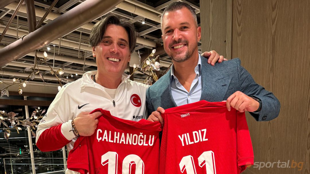 Селекционерът на националния отбор на Турция Винченцо Монтела се срещна с Валери Божинов и му направи специален подарък, видя Sportal.bg. Един от големите голмайстори на Апенините през последните 30 години подари две фланелки на звездите на тима Хакан Чалханоолу и Кенан Йълдъз , които се бяха подписали специално за българина.