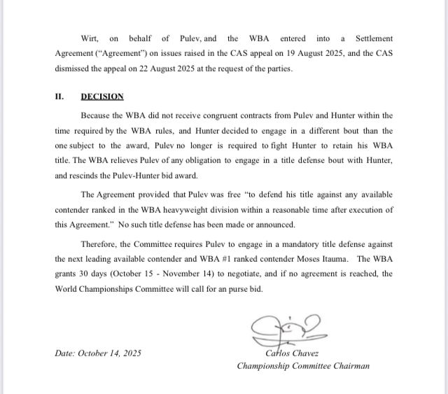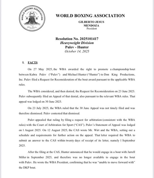След подаването на делото в CAS Хънтър уведомил, че ще проведе двубой с Джарел Милър през септември 2025 г., и следователно вече не е на разположение за мач срещу Пулев. Хънтър писал на президента на WBA, като потвърдил, че „не може да продължи с двубоя“ по договора на Don King Productions.