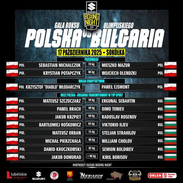 Зрелищна галавечер с участието на водещи имена от националния ни отбор по бокс ще се проведе в петък в полския град Сокулка. Под наставленията на Жоел Арате и Валентин Поптолев родните звезди ще опитат да станат отборни шампиони в 37-ото издание на Suzuki Boxing Night.