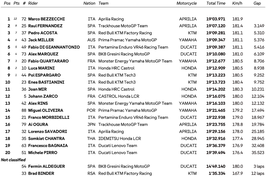 Пълно класиране при пилотите в MotoGP след спринта на "Филип Айлънд"