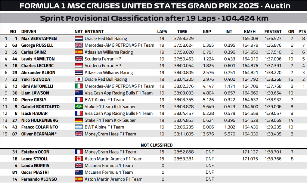 Тройката зад Верстапен и Ръсел оформи Сайнц, а зоната на точките допълниха Хамилтън, Леклер, Албон, Цунода и Андреа Кими Антонели. Италианският пилот на Мерцедес пресече финалната линия на деветото място, но се възползва от наказанието на Беарман, за да вземе последната точка. Пилотът на Хаас беше санкциониран с 10 секунди, след като запази позицията си пред Антонели, излизайки от пистата в 15-я завой.