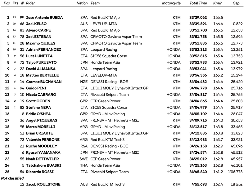 Световният шампион в Moto3 Хосе Антонио Руеда спечели своята десета победа за сезон 2025, след като триумфира в надпреварата за Гран При на Австралия, побеждавайки представителя на домакините Джоел Келсо, който стартира от полпозишъна.