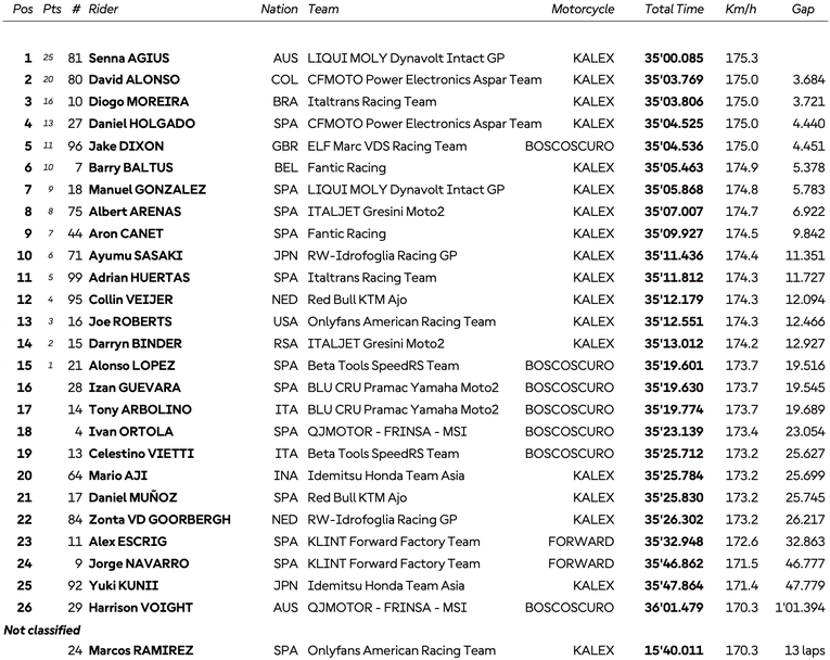 На финала миналогодишният шампион в Moto3 завърши на само 0.037 пред претендента за титлата Диого Морейра, а зад тях в челната петица влязоха още Дани Олгадо и Джейк Диксън. Бари Балтус финишира шести пред лидера в генералното класиране Мануел Гонсалес, който загуби скорост в края и се смъкна до седмата позиция, след като в голяма част от състезанието испанецът беше в борбата за второто място.