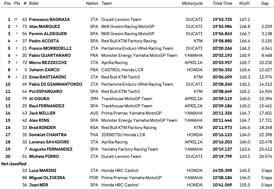За момента обаче той е трети пред Акоста, който завърши на четвъртото място. Зад пилота на КТМ зоната на точките допълниха Франко Морбидели, Фабио Куартараро, Марко Бедзеки, Йоан Зарко и Енеа Бастианини.