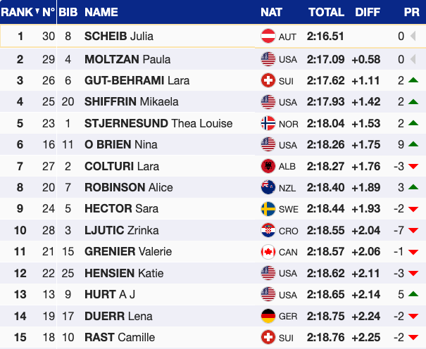 Микаела Шифрин започна позитивно сезона със своето 4-то място, а топ 10 допълниха Теа Луис Стернесунд, Нина О'Брайън, Лара Колтури, Алис Робинсън, Сара Хектор и Зринка Лютич.