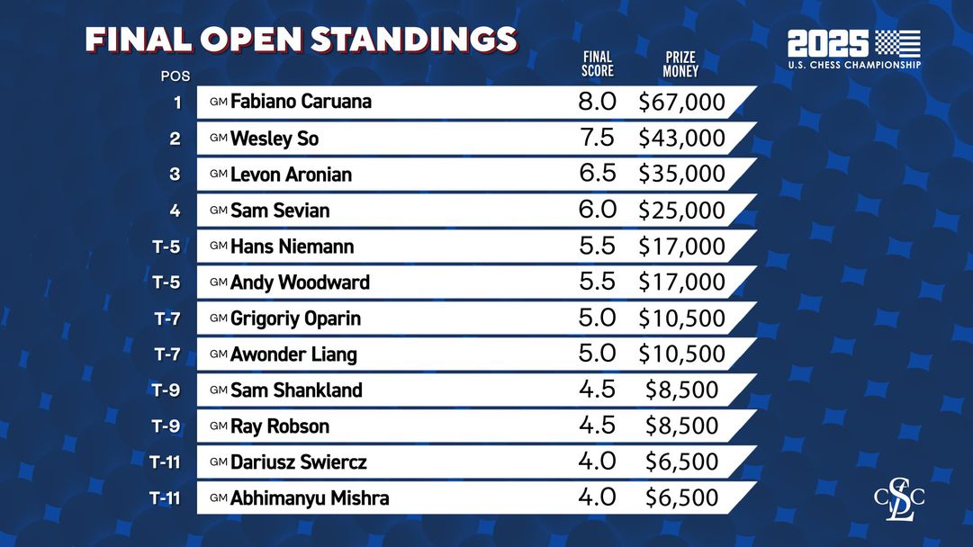 В крайна сметка Опарин успя да насочи партията към сигурно реми, с което помогна на Каруана да спечели петата си титла на шампион на САЩ в кариерата.