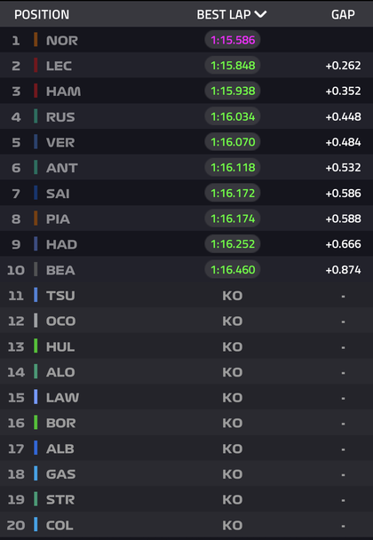 В своя решителен летящ тур обаче пилотът на Макларън постигна 1:15.586, което се оказа непосилно за Леклер, който подобри своя резултат, но завърши на 0.262 зад Норис. Трети на старта ще застане Хамилтън, който направи своята най-добра квалификация откакто премина във Ферари в началото на годината, изоставайки с 0.352 от Норис.