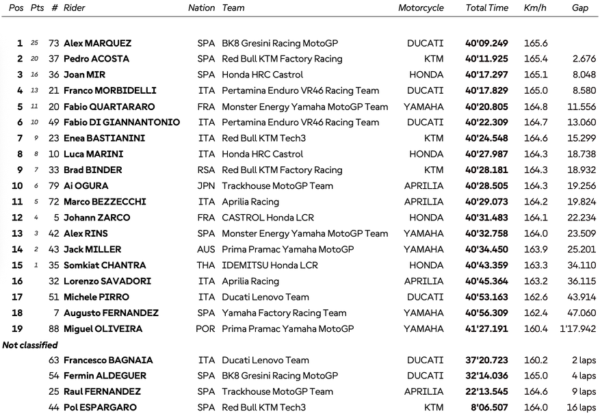 Пилотът на Грезини Дукати изкова своя успех край Куала Лумпур още в първите две обиколки, в които направи две много агресивни атаки в четвъртия завой срещу Педро Акоста и Франческо Баная, за да поведе. След това по-малкият от братята Маркес се възползва от ранната размяна на позиции между Баная и Акоста, за да се откъсне на близо секунда пред тях, което му беше напълно достатъчно, за да изконтролира състезанието до финала.