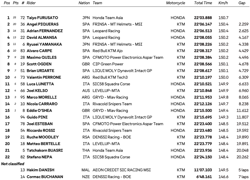 Заради дългото забавяне тя беше скъсена от 15 на 10 обиколки, а в тях Фурусато беше категоричен и напълно заслужено грабна своята първа победа в световния шампионат по мотоциклетизъм на писта. Японецът поведе още в първия тур и след това се възползва от битките между пилотите зад него, за да се откъсне в челото и да триумфира с аванс от 2.2 секунди пред Анхел Пикерас.