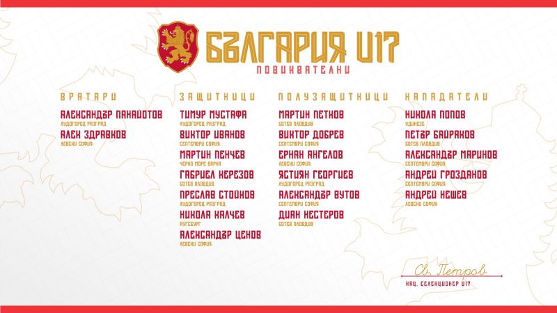 Селекциoнерът на България U17 Светослав Петров определи разширения състав за европейските квалификации в Словакия. Нашите млади таланти ще се изправят срещу отборите на домакина Словакия, Швейцария и Сан Марино в мачове, които ще се проведат в град Попрад.