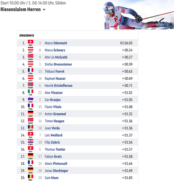 Петкратният носител на Световната купа Одермат спечели трета победа в Зьолден, 27-ма в гигантския слалом и общо 46-та в кариерата си.