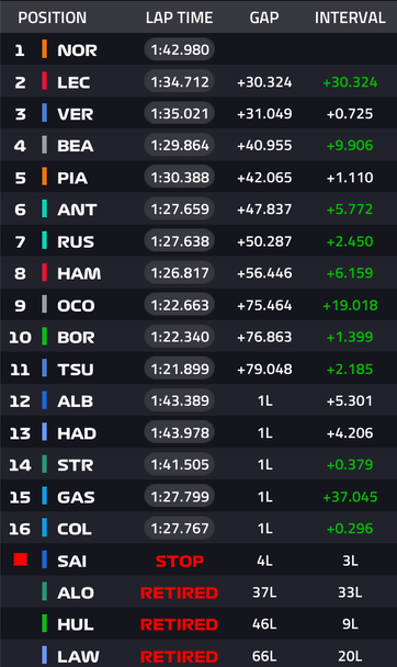 12/71 - В челото Норис вече имаше преднина от 3.5 пред Леклер, който на свой ред водеше с 5.6 пред съотборника си Хамилтън. На 3.5 зад британеца се движеше Беарман, който продължаваше да се откъсва пред Верстапен.