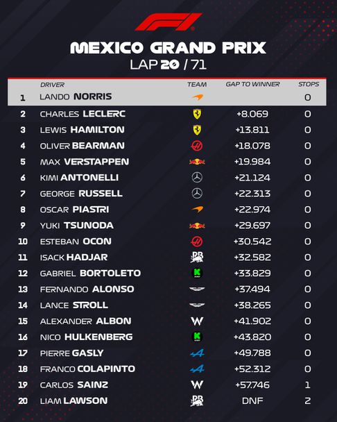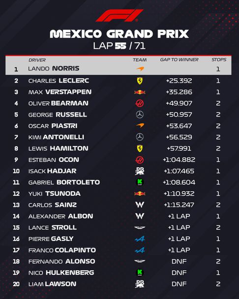 Финал - Ландо Норис с доминанта победа в Гран При на Мексико Сити, Шарл Леклер и Макс Верстапен оформиха подиума пред Оливър Беарман и Оскар Пиастри.