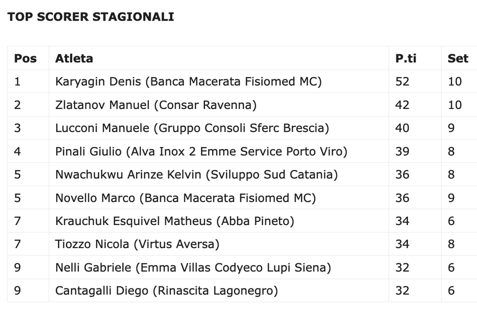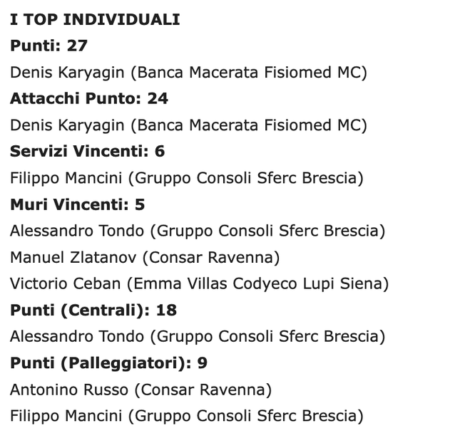 Младежкият национал на Италия Мануел Златанов, внук на легендата Димитър Златанов и син на Христо Златанов, стана най-резултатен за Равена с 24 точки (5 блока, 53% ефективност в атака, 17% перфектно и 50% позитивно посрещане - +14)