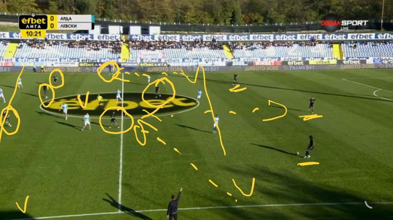 „Сега ще покажем и Левски, за да видят хората колко прилики има. Виждаме кадър от мача с Арда – Левски играе с топката и има инициативата. Отново виждаме трима отзад, както при ЦСКА, но Веласкес го прави с двама централни защитници – Макун и Кристиян Димитров, а трети между тях влиза Георги Костадинов. ЦСКА го правеха с двама централни защитници и бек, а Левски – с двама централни и опорен халф. При ЦСКА Вион влизаше отдясно, при Левски това прави Майкон отляво – нещо, което сме коментирали неведнъж. Когато Майкон влезе, а Георги Костадинов застане между бранителите, втори опорен халф става Асен Митков. Така отпред остават трима – човекът зад нападателя Сула, Сангаре и Марин Петков. Това позволява на Камдем да действа като дясно крило, а Ради Кирилов да осигурява ширината отляво“, анализира още бившият полузащитник на Левски.