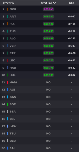 Австралиецът направи много слаба първа обиколка в SQ3, но след това напредна във втория си тур, за да стигне до третото място. До него на втората редица ще застане вторият пилот на Мерцедес Джордж Ръсел, а зад двамата на третия ред ще се наредят Фернандо Алонсо и третият претендент за световната титла Макс Верстапен. Ланс Строл и Шарл Леклер ще оформят четвъртата редица пред Исак Хаджар и Нико Хюлкенберг, които ще допълнят топ 10.