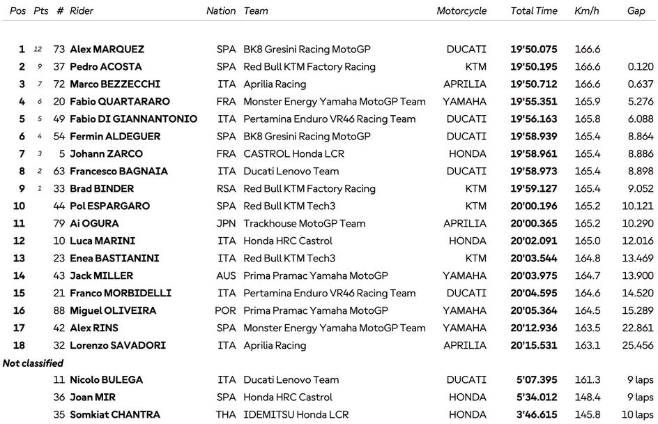 Пълно класиране при пилотите в MotoGP след спринта в Португалия