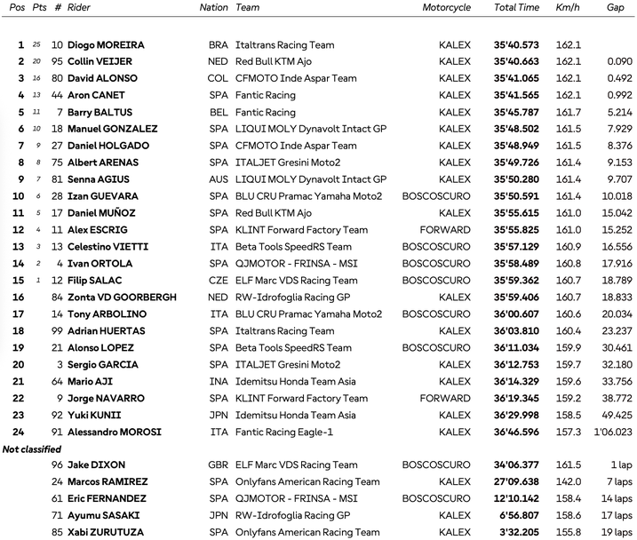 Доскорошният лидер в генералното класиране Мануел Гонсалес пресече финалната линия на шестото място, с което отложи коронацията на Морейра. Испанецът обаче ще се нуждае от чудо в последния старта за сезона във Валенсия, за да попречи на своя съперник да донесе историческата първа световна титла за Бразилия от световния шампионат по мотоциклетизъм на писта.