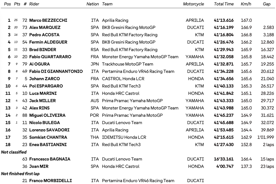 В генералното класиране с победата си днес Бедзеки направи огромна крачка към третото място. В битката за него италианецът води с 35 точки пред Франческо Баная, който днес регистрира четвъртото си поредно неделно отпадане. Акоста изостава с 38 пункта от Бедзеки, което означава, че пилотът на КТМ математически няма как да завърши на подиума в края на сезона.