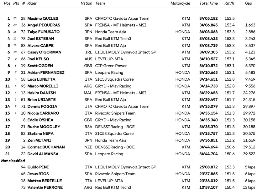 Тройката оформи победителят от Гран При на Малайзия преди две седмици Таийо Фурусато, а зад него Джоел Естебан и Алваро Карпе завършиха четвърти и пети. Кейси О'Горман пресече финала на шестото място пред ранния лидер Келсо, който остана едва седми.