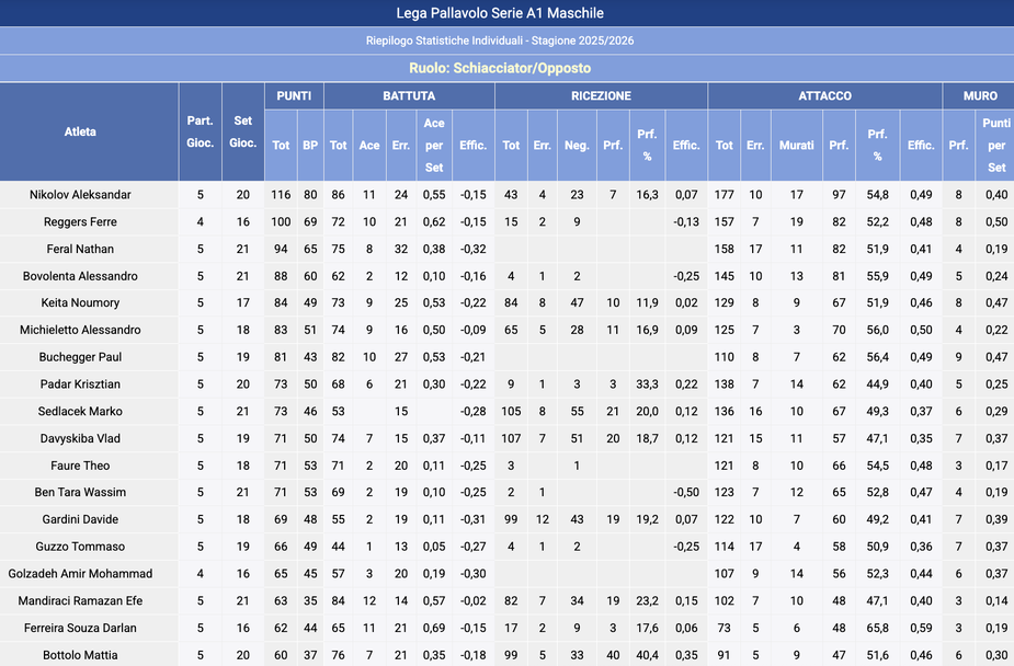 Така най-резултатният волейболист на Световното първенство във Филипините Алекс Николов вече има в актива си 116 точки (11 аса, 8 блока)в първите 5 мача на Суперлигата на Италия, с което отново излезе начело в класацията за реализатори.