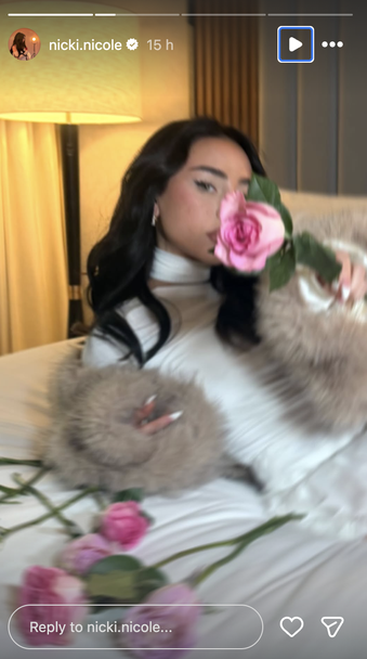 Брюнетката сподели снимка в Инстаграм, за която позира в леглото в компанията на розови рози, а по всичко личи, че е доволна от букета, който е получила. От кога е той обаче остава пълна мистерия.