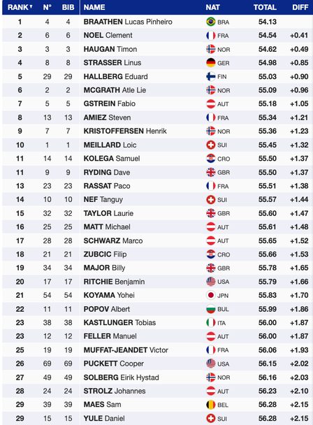 Топ 10 след Бротен Пинейро допълниха Клеман Ноел, Тимон Хауган, Линус Щрасер, Едуард Халберг, Атле Лие Макграт, Фабио Гъщрайн, Стефан Амие, Хенрик Кристоферсен и Лоик Меяр. Даниел Юл заедно с Йоханес Щролц с равно време затвориха топ 30 и се класираха за втория манш от 14 часа.