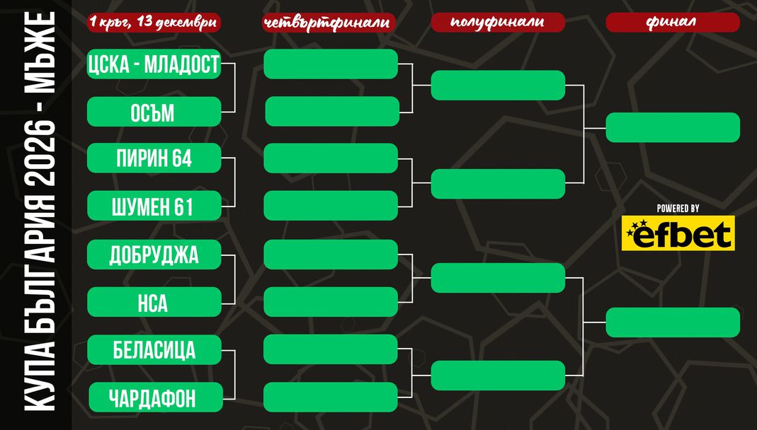 Двубоите ще се изиграят на 13 декември, а съперници в тях ще бъдат ЦСКА - Младост срещу Осъм, Пирин 64 - Шумен 51, Добруджа - НСА и Беласица - Чардафон.