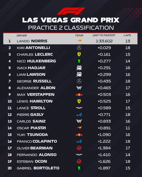 Иначе зад него четвърти и пети се класираха Нико Хюлкенберг и Исак Хаджар, а в топ 10 попаднаха още Лиам Лоусън, миналогодишният победител в Лас Вегас Джордж Ръсел, Алекс Албон, Макс Верстапен и Люис Хамилтън. От всички пилотите в първата половина на класирането единствено Норис, Антонели, Хюлкенберг, Хаджар, Лоусън и Албон направиха обиколки с меките гуми.