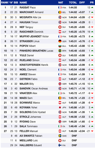 Топ 8 допълниха Тимон Хауган, Танги Неф, Доминик Рашнер, Виктор Муфа-Жанде и Линус Щрасер. Извън топ 10 пък останаха знаменити имена като Даниел Юл (11-ти), Хенрик Кристофершен (12-ти), Клеман Ноел (12-ти), Марко Шварц (21-ви) и Мануел Фелер (27-ми), а Лоик Меярд дори не завърши втория манш.
