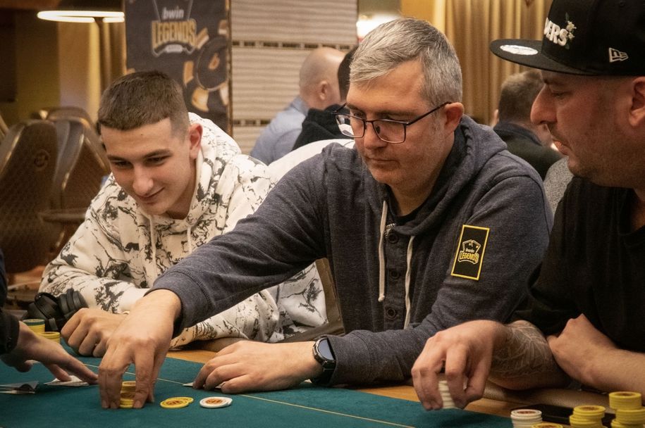 Недялко „Unkind1baby“ Андреев (на снимката) беше останал само с 1 чип от 5 000, буквално на два elimination-а от Mystery Bounty фазата. Българският стриймър и bwin legends инфлуенсър влезе all-in от under the gun с последния си блайнд. Иван Денев плати от бутона, а и големият блайнд се включи в ръката.