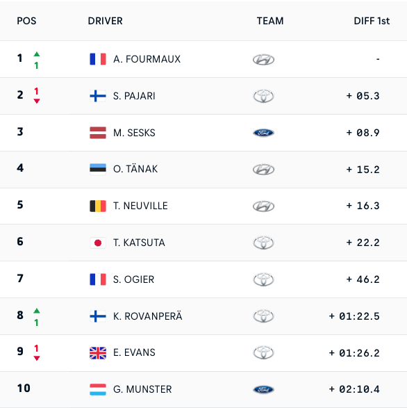 Зад него четвърти и пети се движат Ойт Танак и Тиери Нювил, които изостават със съответно 15.2 и 16.3 от първото място. На 5.9 зад Нювил е Такамото Кацута, а едва седми е първия от претендентите за световната титла Себастиен Ожие, който изостава с 24.0 от своя съотборник в Тойота.