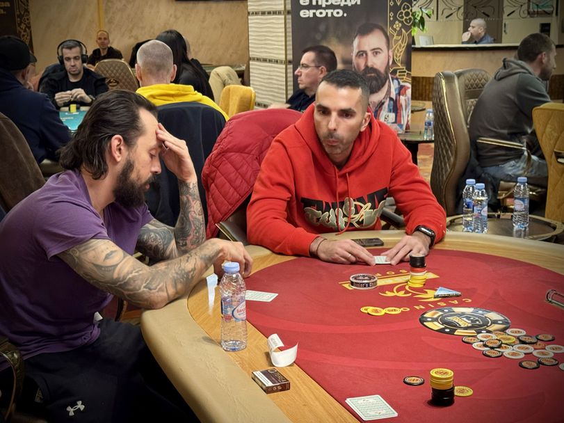 Александар Спасов (ляво на снимката) вдигна до 15,000, а след него Деян Алексиев (дясно на снимката) от бутона върна още по-силно – all-in за около 47,000.