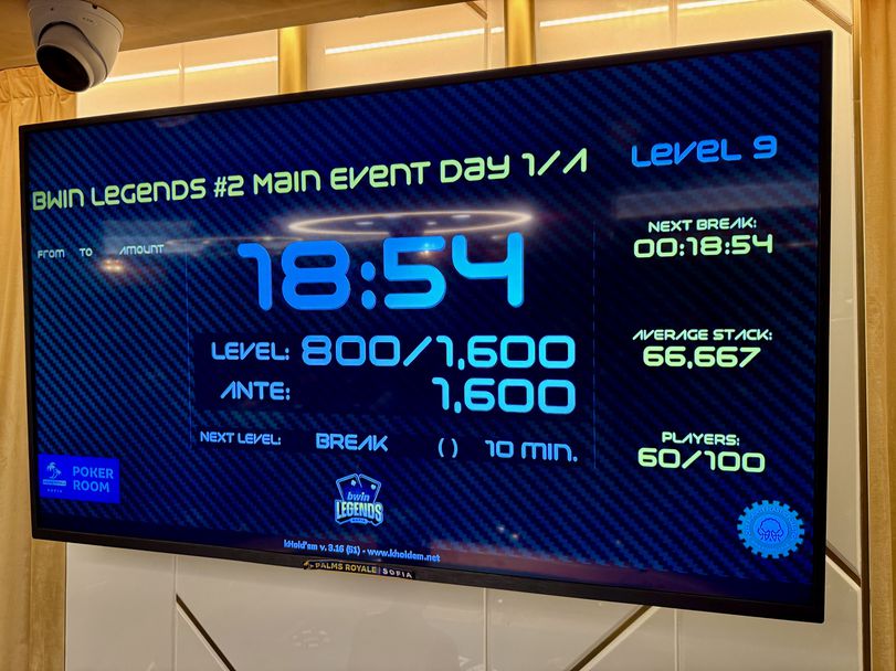 Още на ниво 1 вече имаме 60 ентрита, а регистрациите продължават да се увеличават с всяка минута. Темпото по масите е оживено от самото начало, а в залата се виждат много познати лица. Сред участниците днес са bwin Legends инфлуенсърите и популярни Twitch стриймъри